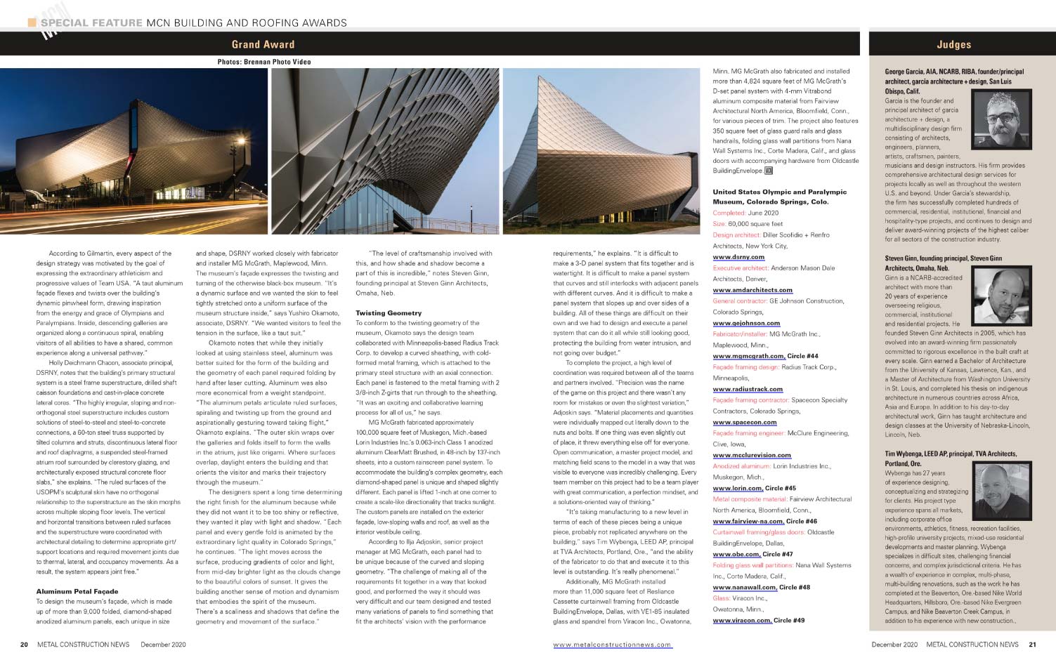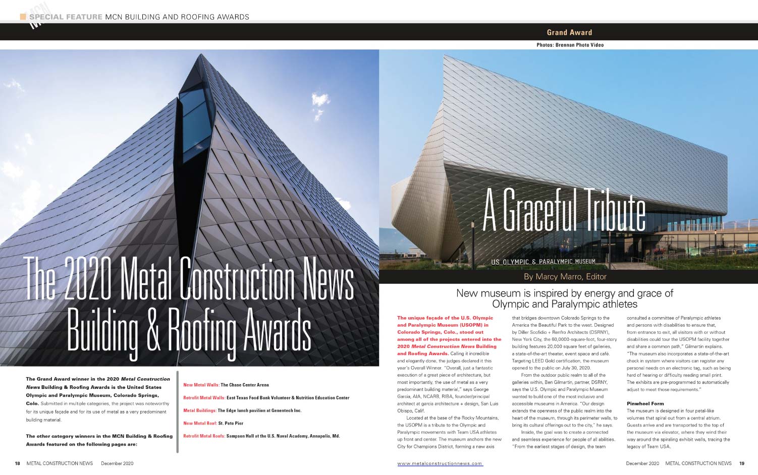 Metal Construction News announced the winners of their 2020 Building & Roofing Awards and MG McGrath projects took home wins in 3 of the six possible award categories. One of the project winners for this years competition was the United States Olympic and Paralympic Museum which took home the overall Grand Award for the whole awards competition. As the Grand Award winner, USOPM also made the front cover of Metal Construction News’ December magazine issue. The judges were just as in awe as visitors to the museum are with the stunning, complex, and bold use of metal that makes up most of the building’s facade. Congratulations to the project teams of the United States Olympic and Paralympic Museum on this amazing award!