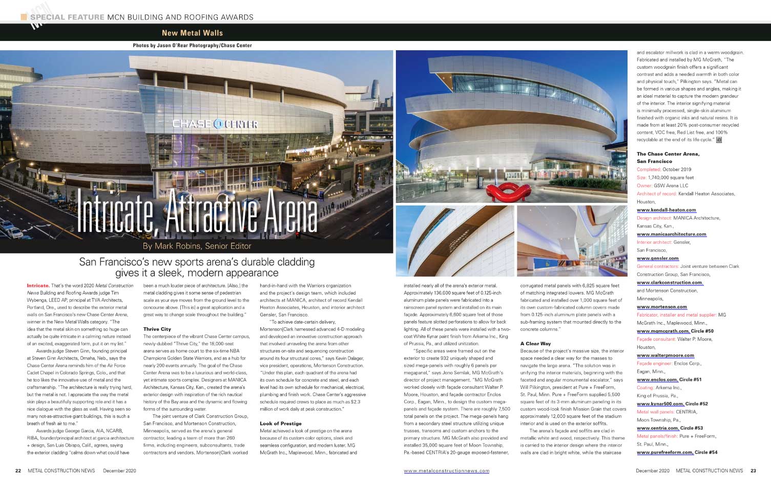 Metal Construction News announced the winners of their 2020 Building & Roofing Awards and MG McGrath projects took home wins in 3 of the six possible award categories. One of the project winners for this years competition was Chase Center Arena which took home the award for the New Metal Walls category. The judges were impressed that a huge metal facade of this size could be so intricate and not overpower itself. The architecture on this building is truly stunning, and the metal facade really lets the amazing details speak for themselves. Congratulations to the project teams of Chase Center Arena on this amazing award!