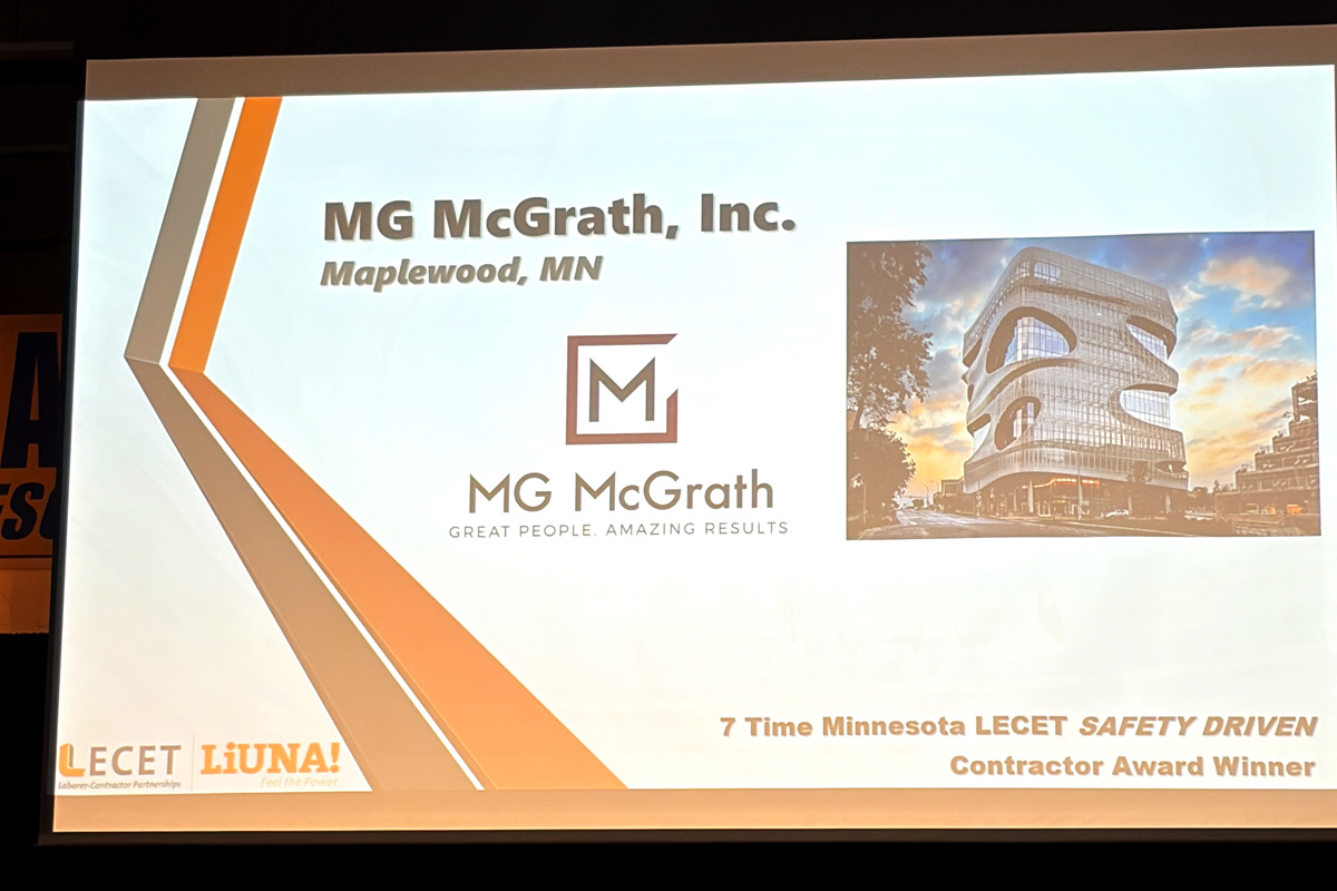 This month, MG McGrath was awarded LECET’s Safety Driven Contractor Award of Excellence. This distinction is awarded to MN and ND union contractors for exceptional safety performance, policies, and a proactive approach to keeping laborers and the public safe. MG McGrath surpassed the safety performance standards outlined by the Laborers-Employers Cooperation & Education Trust (LECET) and we are especially proud of safety recognitions like this one. The safety of our employees, other workers on our jobsites, and the public is our top priority, and awards like this reinforce our commitment to keeping everyone safe.