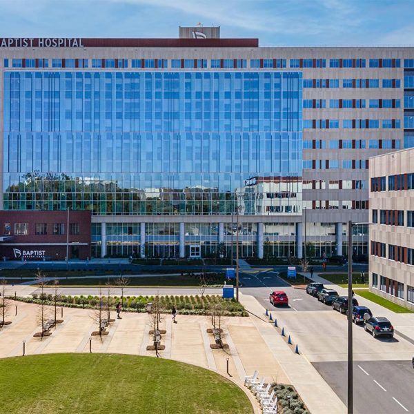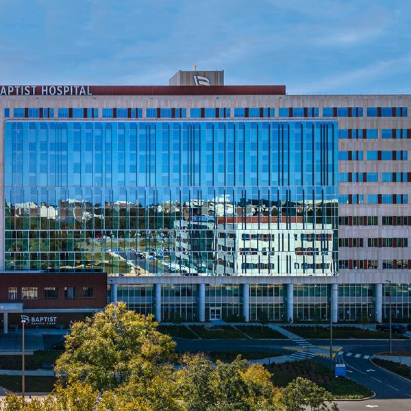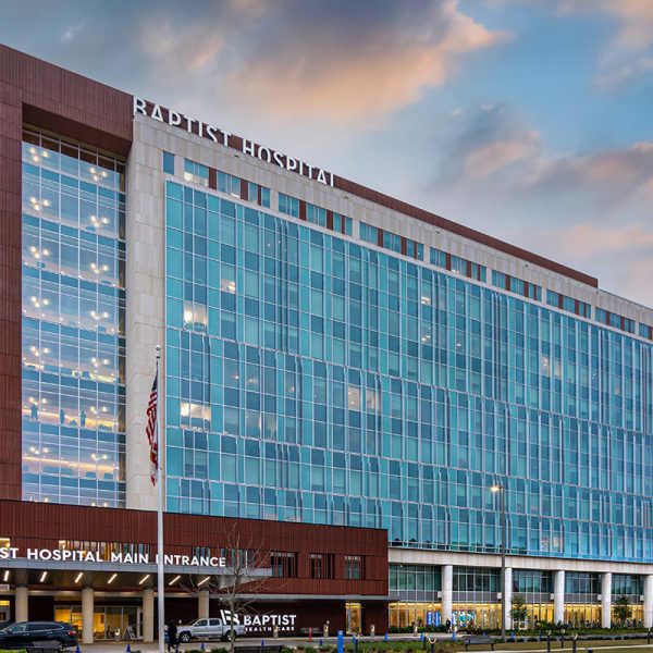 Our team worked on two of the three buildings on this new Baptist Medical Campus with the bulk of the work being done on the main hospital. MG McGrath partnered with GATE Precast to provide and install a unitized facade system that utilized our glass & glazing systems together with their GateLite architectural precast concrete on the exterior facade of the new hospital. Floors 1-10 feature over 45,000 square feet of YKK’s 300 OG curtain wall system with Viracon glass, and 28,600 square feet of YKK’s YHW 60TU window wall system with Viracon glass. The systems are fully captured and hurricane impact rated. Additional glass work provided and installed by our team includes 7 leaf’s of aluminum framed, medium stile glass doors and 8 Stanley DuraStrom 3000 BP-Impact automatic sliding glass doors.