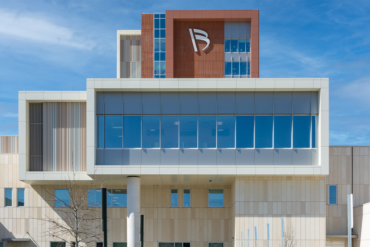 For the campus hospital and medical buildings, our team fabricated and installed 22 gauge prefinished steel panels that included 17,500 square feet of them for the wall cladding, and an additional 18,800 square feet of them at the penthouse roof enclosures. New 2,000 square foot and 3,000 square foot aluminum screen wall were also added with matching trim. The hospital also features over 7,000 square feet of beige and brown baguette-style terracotta panels. The last bit of metal paneling on the main hospital has over 27,000 square feet of aluminum composite (ACM) Vitrabond panels at the east and west framing areas, soffits, and canopies.