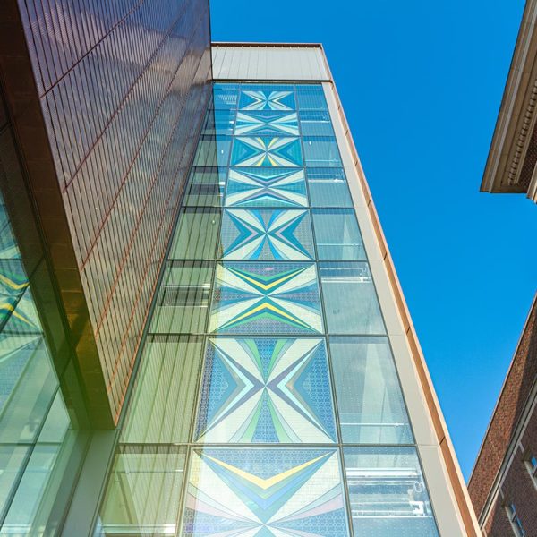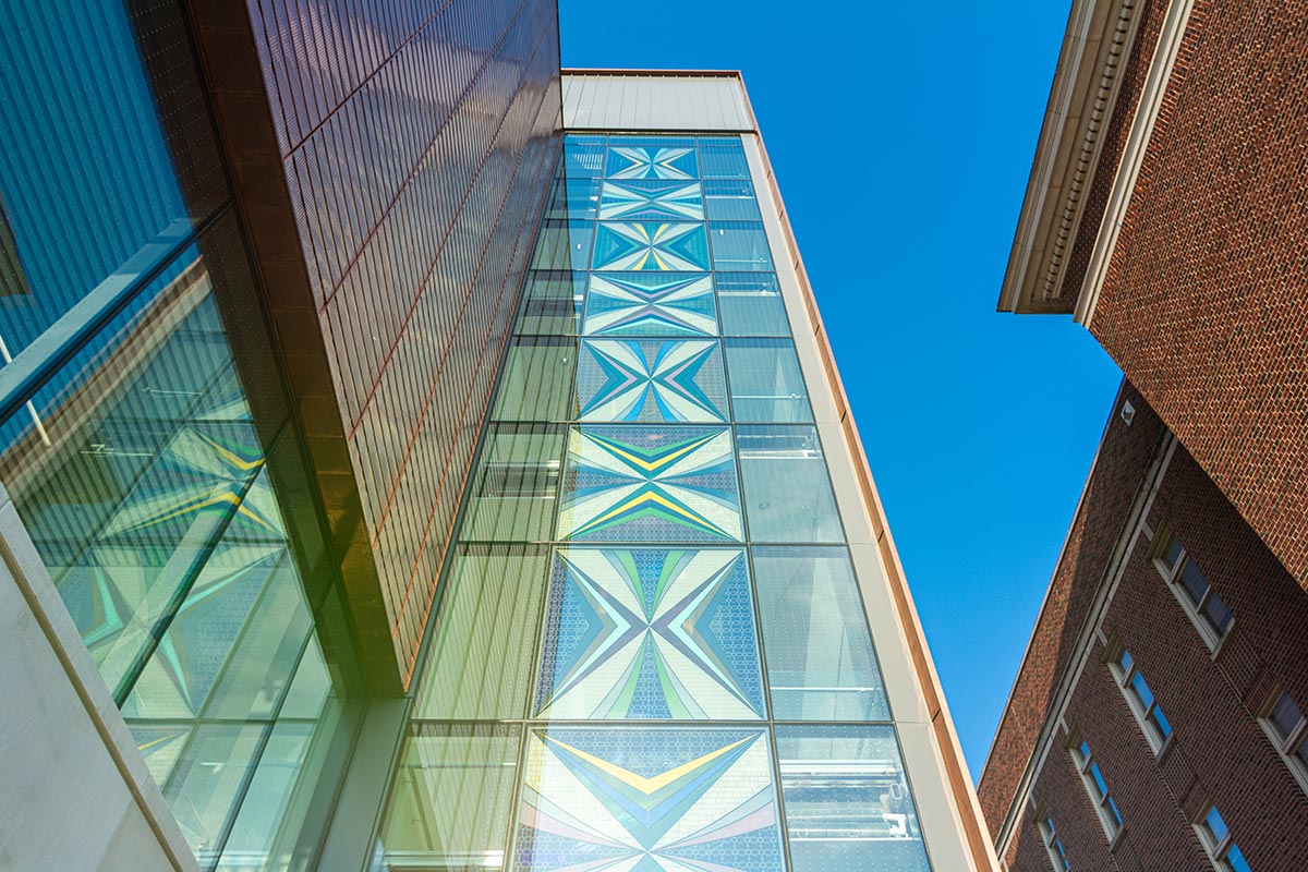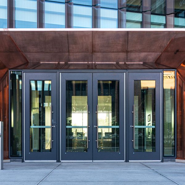 The main elevations of Fraser Hall feature nearly 25,000 square feet of EFCO’s 5600 Series curtain wall system that was installed by our glaziers. This curtain wall system features various glazed in Solarban low-e and tempered glass and a custom “Fraser Grey” painted finish on the framing. Certain curtain wall elevations were also installed with custom-made vertical blade attachments for the perforated sunshade fins. For the interior glass systems, our team installed 7,800 sqft of aluminum storefront with integrated glass entrance doors. For these systems we used tempered safety glass as well as both clear and opaque monolithic glass. The last bit of interior glass & glazing work partition glazing at the north stairs, glass dividers, and fire rated glazing.