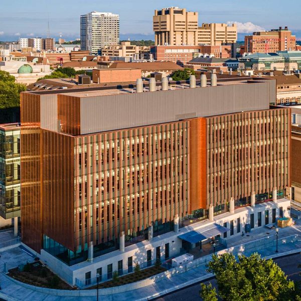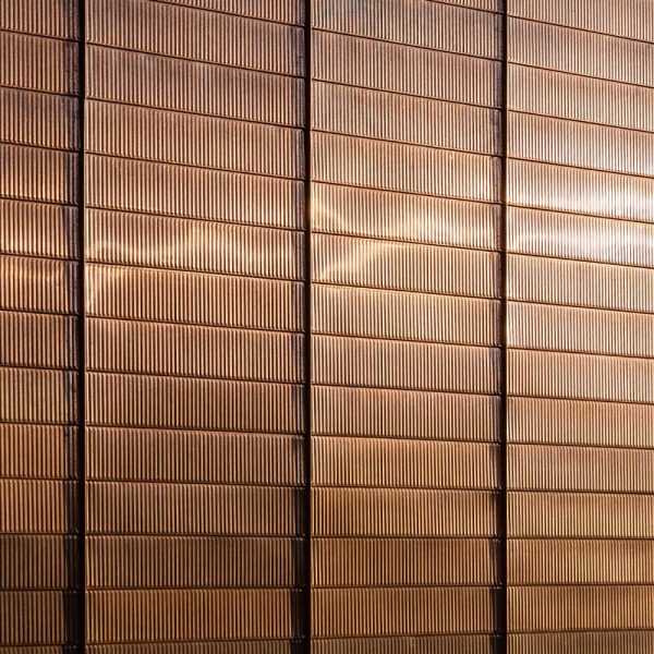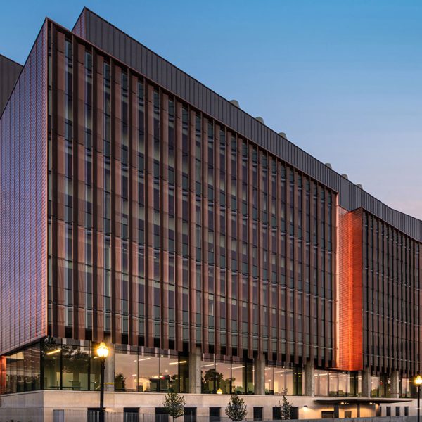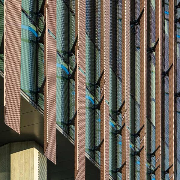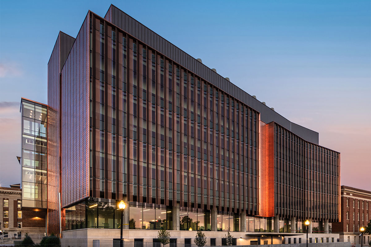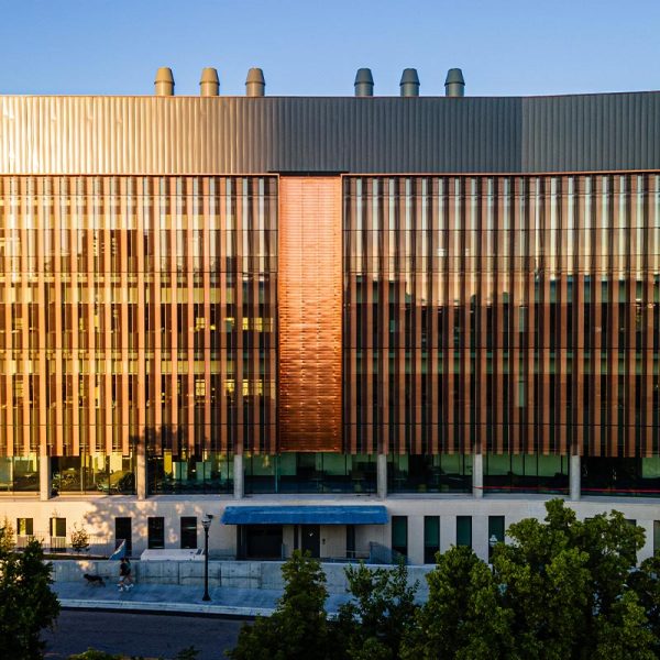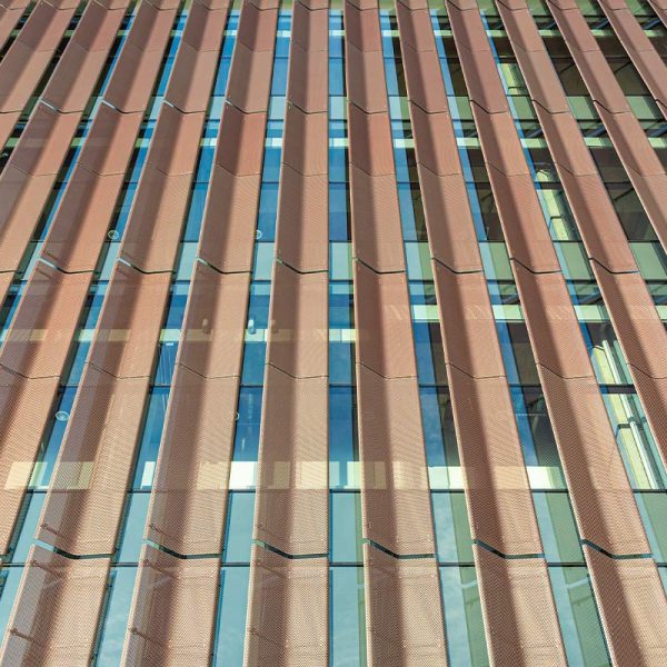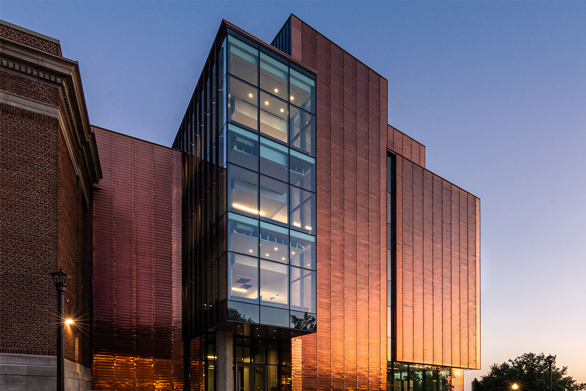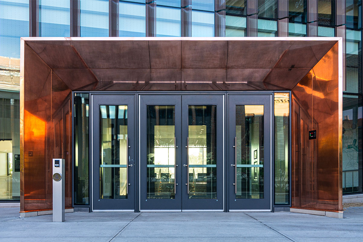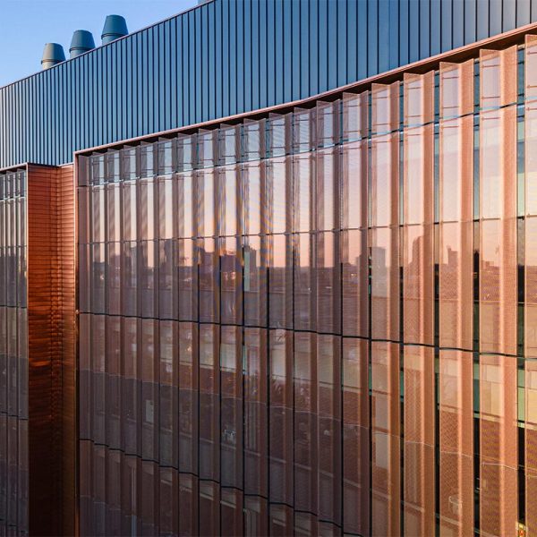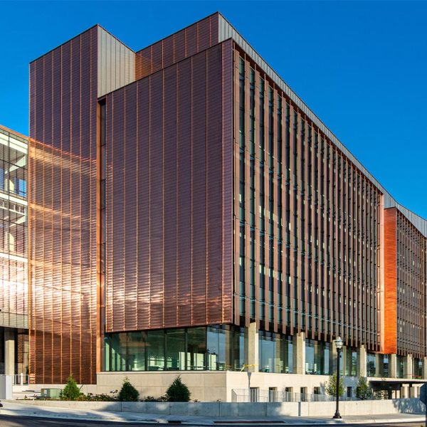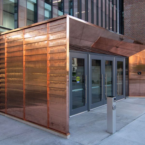 Fraser Hall certainly stands out with sweeping views of floor to ceiling glass and a shiny copper façade. Our team custom-fabricated 15,607 square feet of 16oz copper panels with personalized embossing and a natural copper finish. Each panel was pressed into a specially made stamp to give it a ribbed profile and then fabricated into our own S-Slip panel system for the main portions of the façade. At the curtain wall, vertical blade attachments were used to affix over 1,000 square feet of .080” aluminum sunshade fins directly into the glass curtain wall. The fins feature a curved profile with perforations and a copper anodized finish. The penthouse on the top of the building features several different systems including 7,853 square feet of Pac Clad’s 24 ga. snap-on batten standing seam panels in the custom “Fraser Gray” painted finish along with 1,820 square feet of louvers from Construction Specialties Louvers. 2,500 square feet of aluminum flush seam panels were fabricated and installed at the soffits, entrance overhangs, and parapet walls in that same custom “Fraser Gray” painted finish. The interior of Fraser Hall opens up with 1,500 square feet of “Fraser Grey” finished plate panels on the entryway. Additional interior work from our team includes copper composite panels at the southeast entrance, copper plated ACM panels at the north staircase, radiator heat covers, and other various interior decorative metal panels.