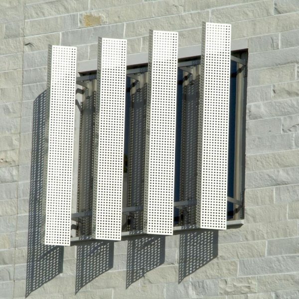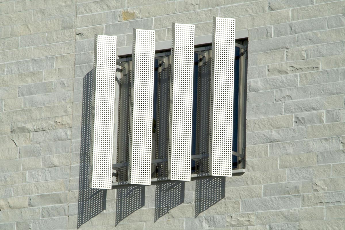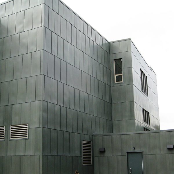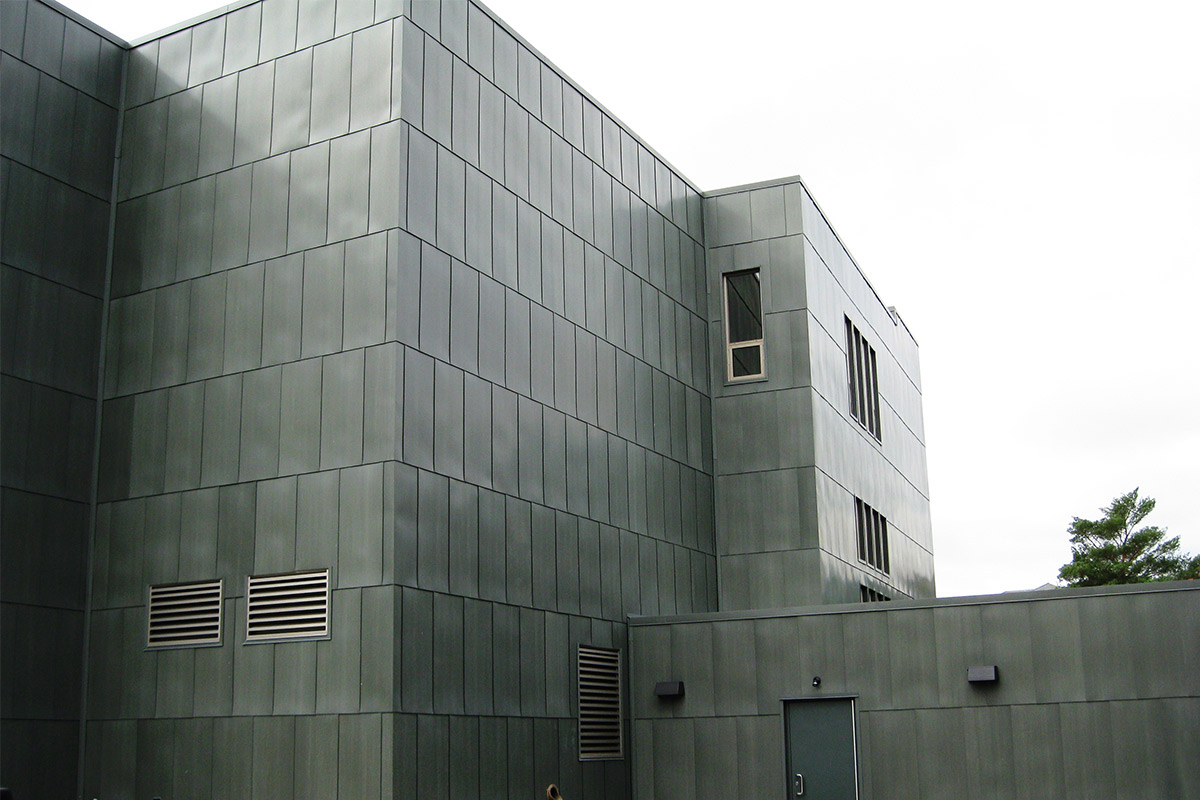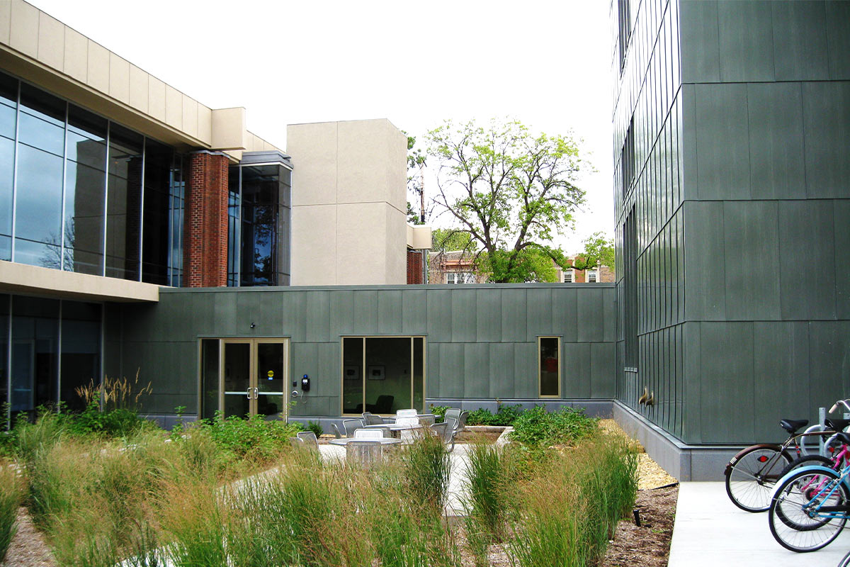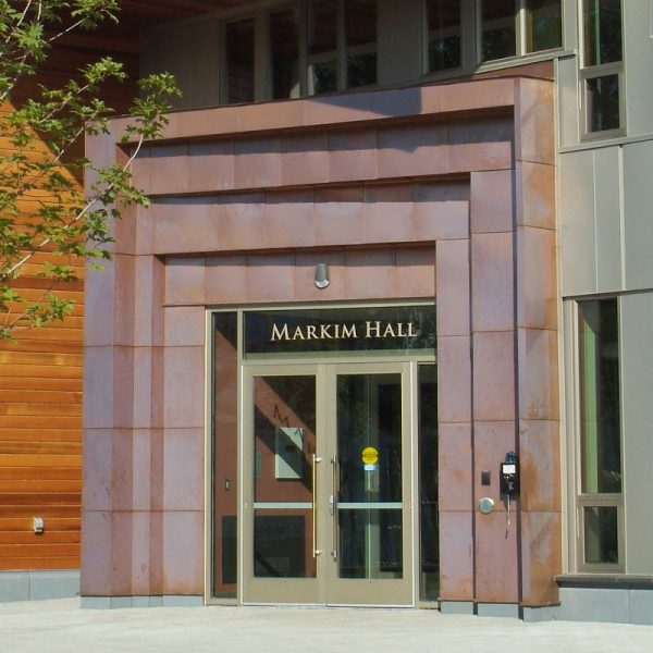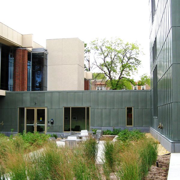 Working on the IGC was our first job for Macalester College. Our team fabricated and installed a variety of metal panel materials and styles for this project that would all contribute to their LEED Platinum Certification goals. The main entrance to Markim Hall has a gorgeous 16oz copper archway done by our team. It features 3,500 square feet of copper material in our own hook-seam panel system. The back courtyard area of the hall has 8mm zinc cladding in a similar hook-seam panel style with a Graphite Grey finish. Various exterior elevations also have 4,500 square feet of aluminum plate panels fabricated and installed with a clear anodized finish. The last bit of work our team did for this building was installing vertical louvers and standard metal sunshades from Industrial Louvers.
