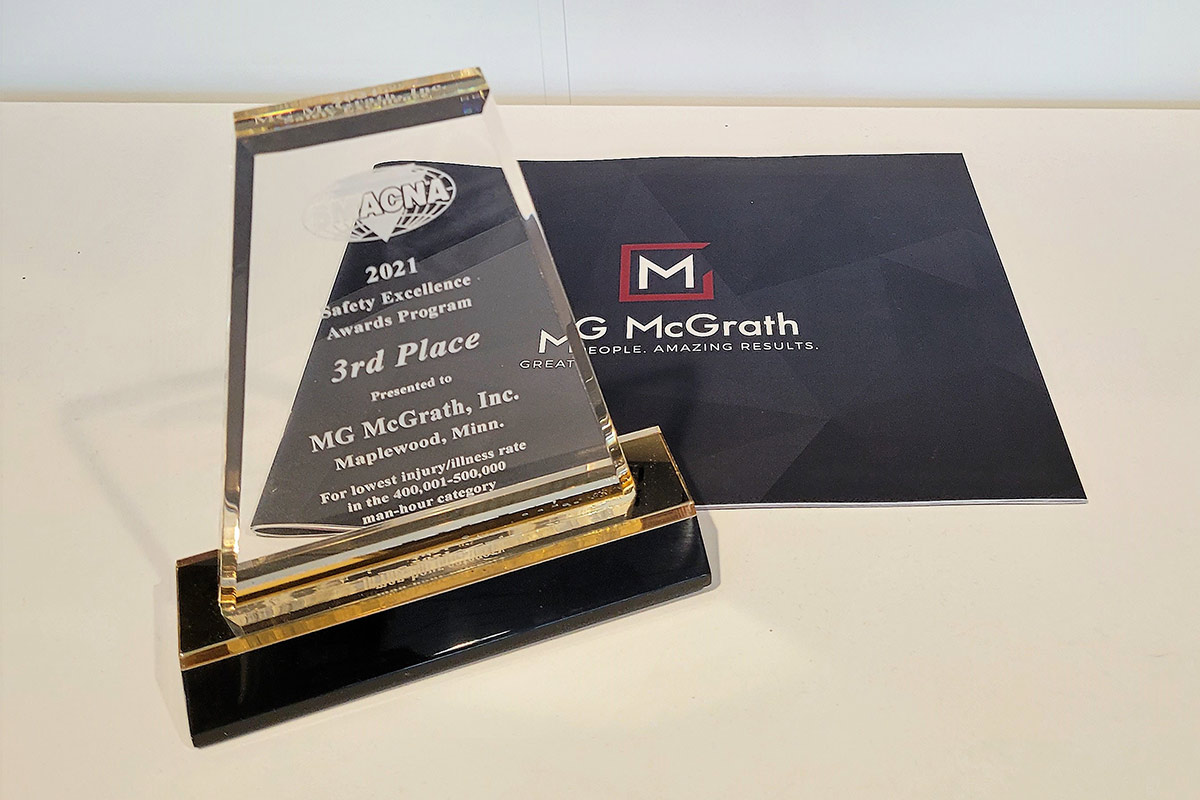 The Sheet Metal and Air Conditioning Contractors’ National Association (SMACNA) has recently chosen winners for their annual Safety Excellence awards and among the winners is MG McGrath Inc. We were recognized as the third place winner in the 400,001 – 500,000 man-hours worked category.
